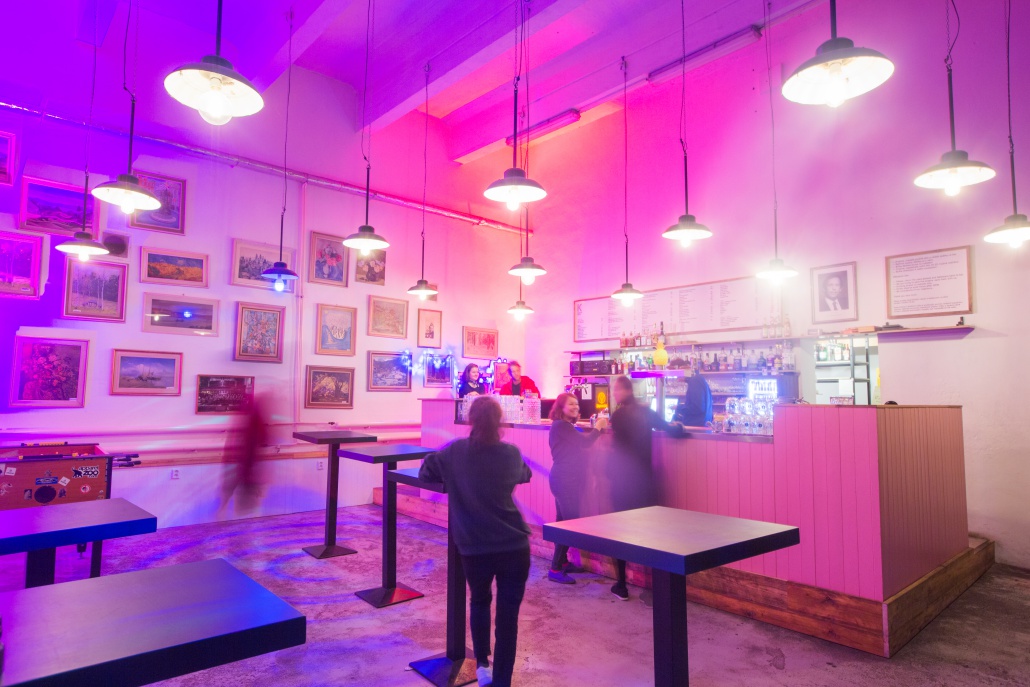 This stylish bar can be found next to our concert hall in the Garage. Here, in an original art gallery, we tap beer and mix drinks for concert, cinema or lecture visitors. As the bar can be opened on one side and connected to the outdoor space (see photo below), we also serve all visitors in the courtyard.